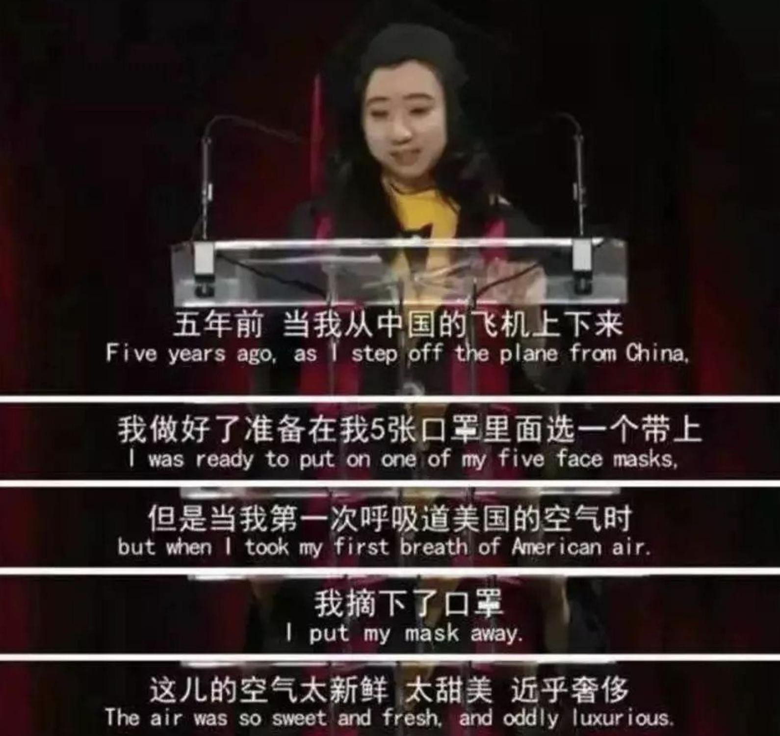 “我在中国的一座城市长大,在那里我只要出门,就必须戴口罩,不然我可能会生病,然而,在机场呼吸到美国空气的那一刻,我感受到了自由。”