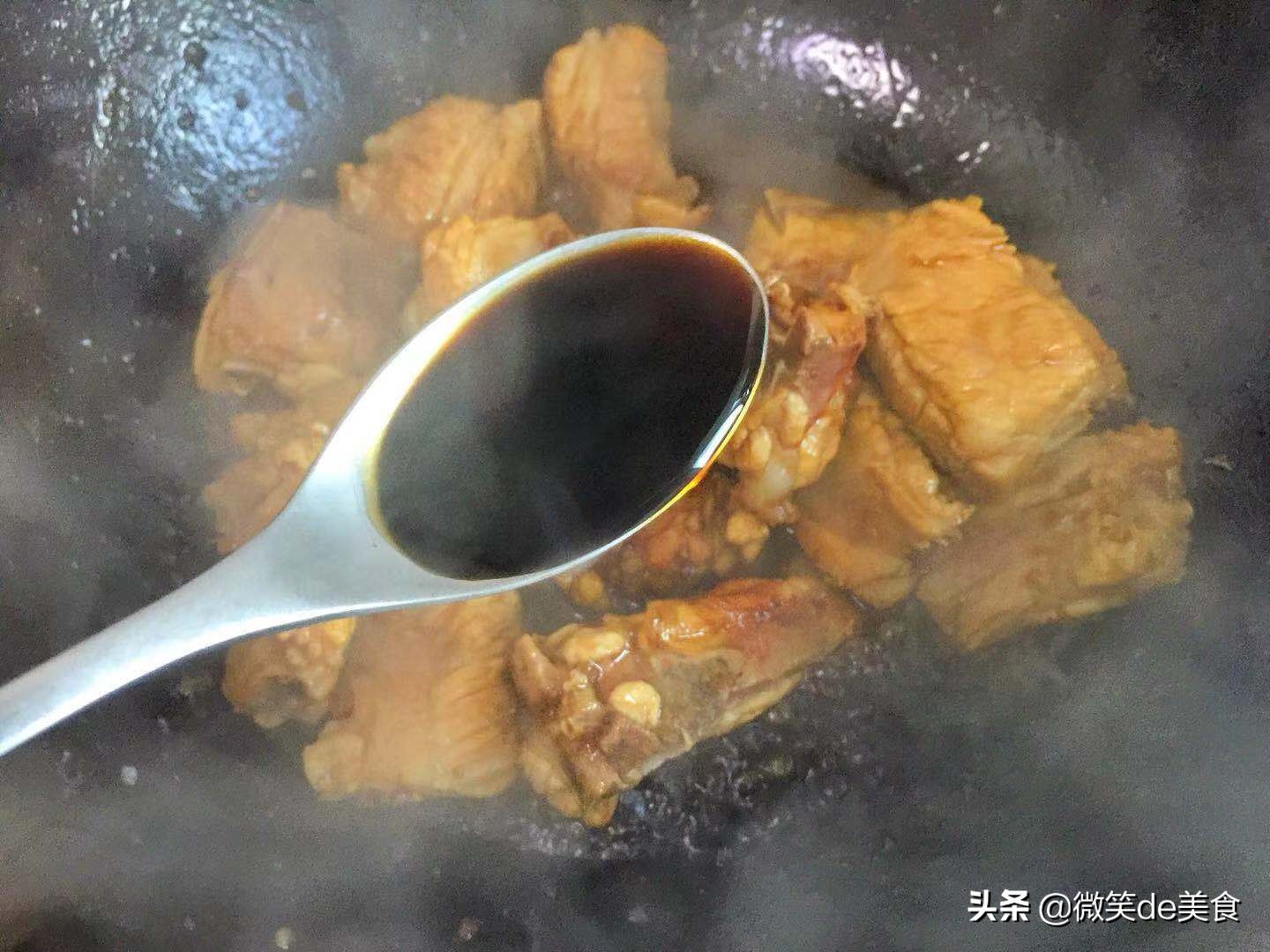 5,然后加入开水,水量要没过排骨,大火烧开后转中小火慢慢炖,也可以把炒锅中的排骨转移到压力锅中炖 20 分钟左右,我的习惯是炒锅中水开后再把排骨转移到铸铁锅中炖,用铸铁锅炖的排骨要比用压力锅炖的在口感上更加紧实,但是相对炖的时间也会长一些,大约在40分钟左右,用筷子可以扎透排骨即可,如上图所示。