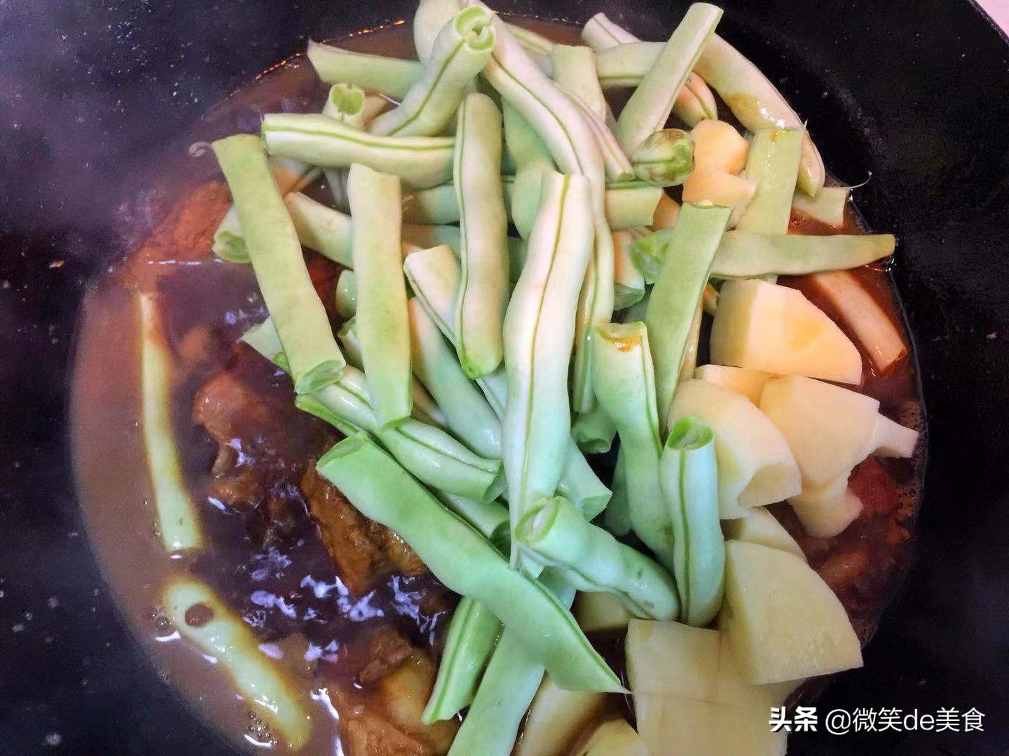 6,排骨炖至用筷子可以扎透后再放入豆角和土豆,继续炖至豆角变软,大约10~15分钟,如上图所示。