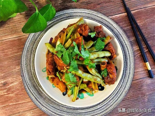 7,酱香味十足的排骨炖豆角就做好了,出锅前撒上适量的香菜段或葱花就可以了,如上图所示。