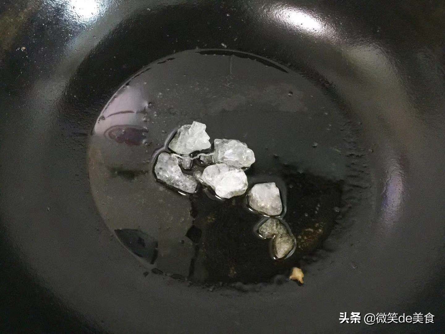 2,点火起锅,锅中加入适量的底油,再放入冰糖,小火慢慢炒出糖色,如上图所示。