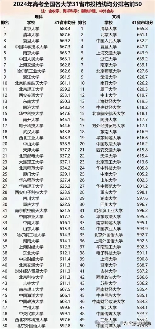 在2024年公布的全国高考投档分数线平均分排名中,中山大学以638.5分的平均投档分数线排名理科全国第20位,以619.7分的平均投档分数线排名文科全国第12位。