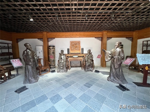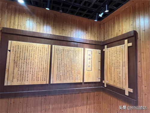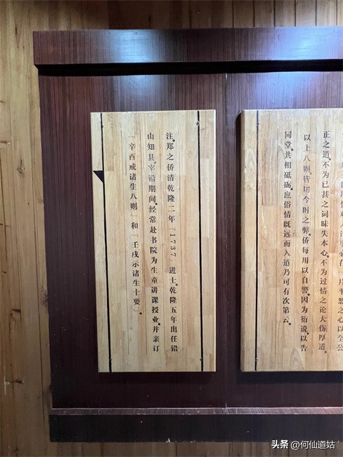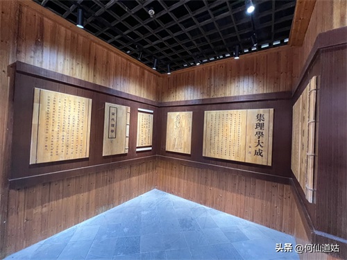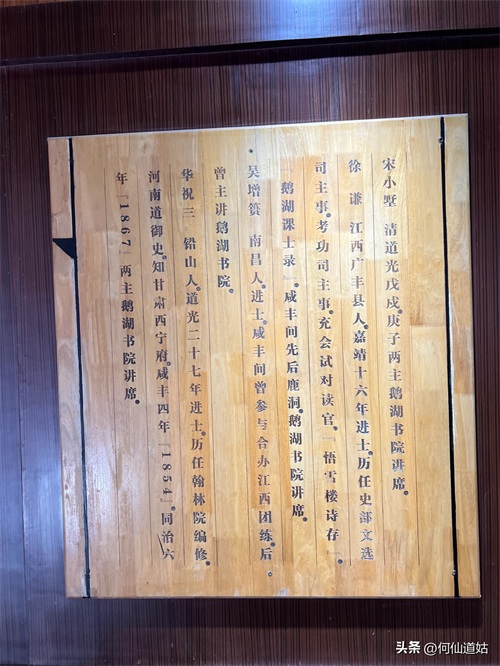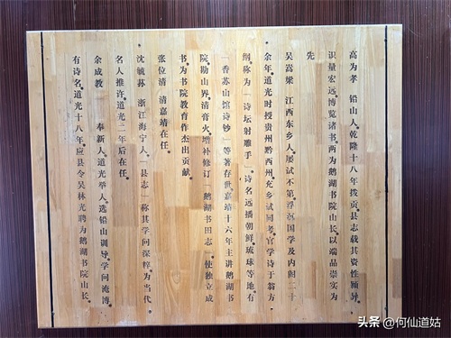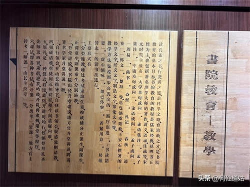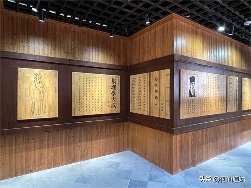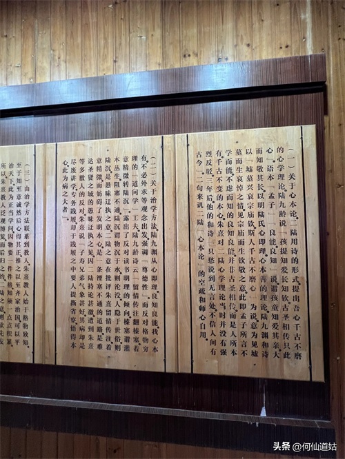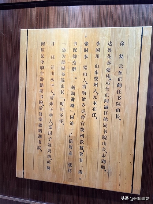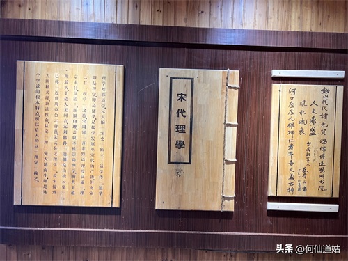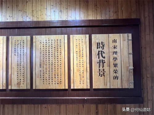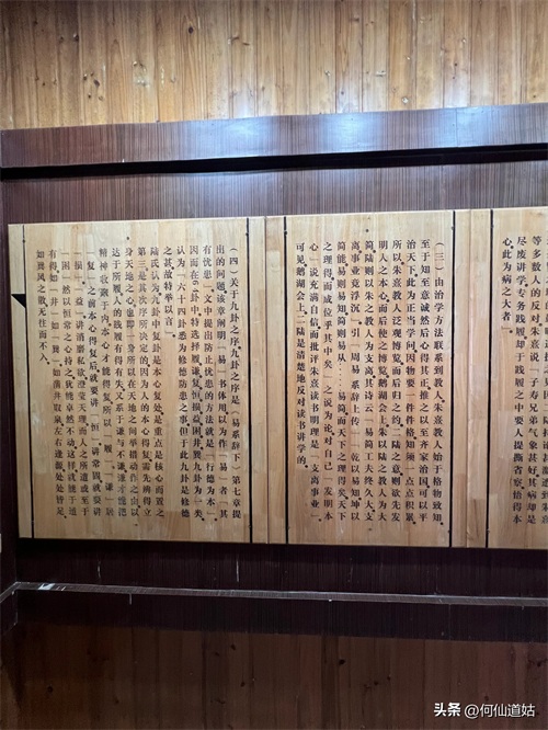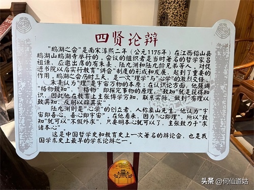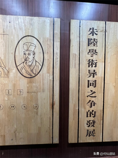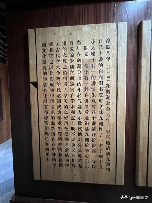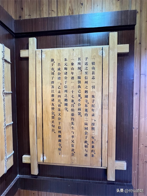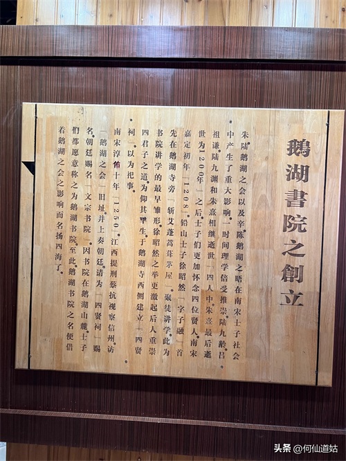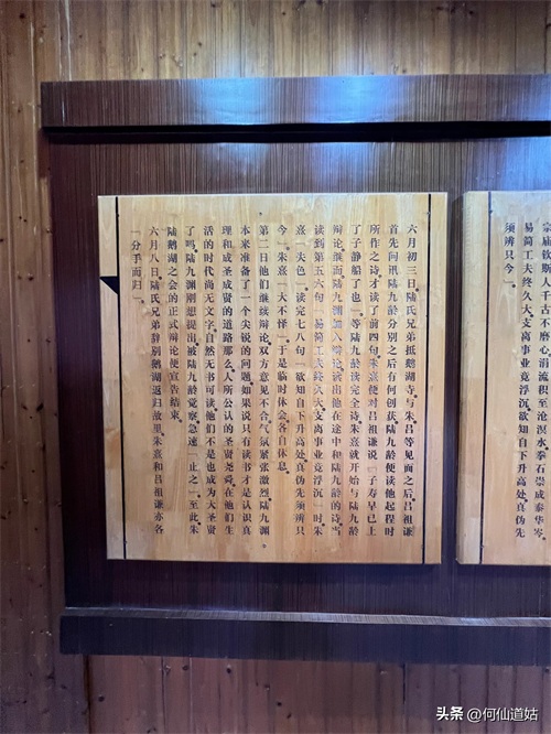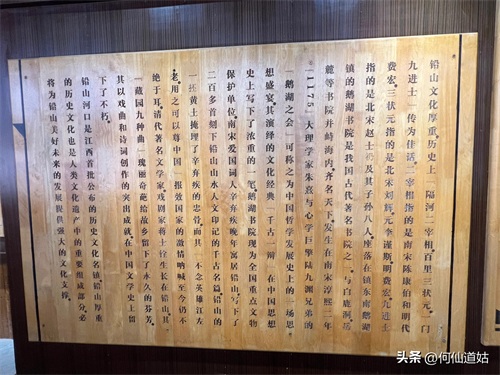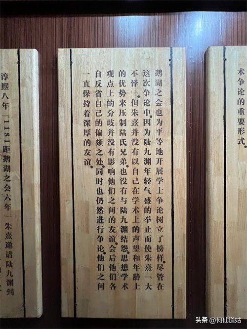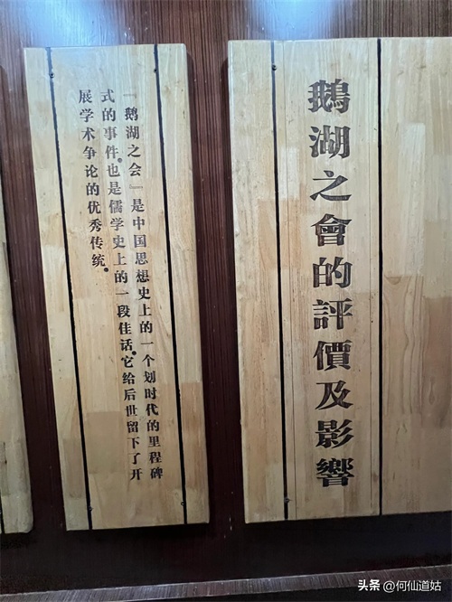 在鹅湖书院,可以看到过去书院的辉煌,那就是,在鹅湖书院“鹅湖书院文化展示厅”里,以传统的展览形式展示着鹅湖书院的“千年一辨”的盛况,及百年一晤的解说。不过,展示板不是用纸,而是用木板,米黄色木板,火烫的字,涂上了褐色。