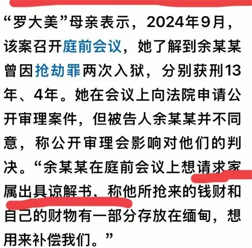 现在,三个凶手全都归案,而且2月28日开庭审理了。据了解,在开庭之前,三个凶手竟然希望罗大美的家人出具一个谅解书,表示他们有一些钱在缅甸,可以拿回来补偿。
