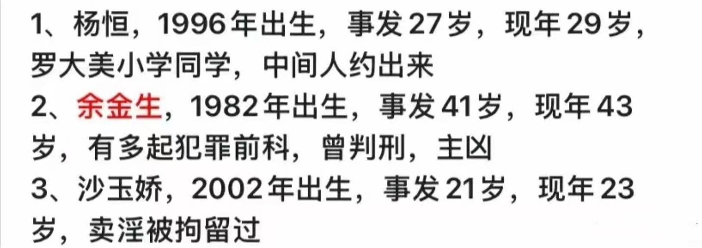 大家记住这三个人的名字:余金生,沙玉娇,杨恒,他们就是害死罗大美的凶手!这里面,其实一开始只有杨恒认识罗大美,但两人也不是媒体之前所说的小学同学,两人只是以前打工时认识的所谓朋友。后来经杨恒引荐,罗大美又认识了余金生。罗大美比较善良,对人没有防备。余金生从杨恒的嘴中,知道了罗大美非常有钱,于是动了抢劫的念头。这个余金生是个有前科之一,今年41岁的他,有十七年是在监狱里度过的。