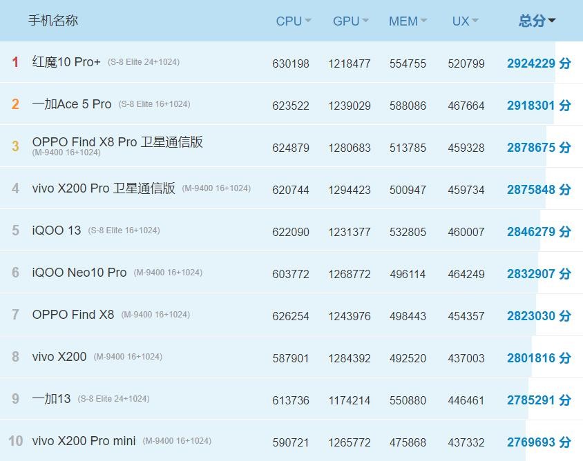排名前十的手机分别是:红魔10 pro+、一加ace5 pro、oppo Find x8卫星通信版、vivo x200 pro卫星通信版、iqoo 13、iqoo neo 10 pro、oppo Find x8、vivo x200、一加13、vivo x200 pro mini。