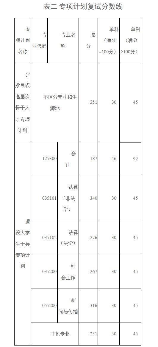根据教育部《2021年全国硕士研究生招生考试考生进入复试的初试成绩基本要求》(以下简称国家线),结合学校招生计划情况,按照差额复试比例要求,部分专业在符合国家线的基础上进行自划线。普通计划见表一和表二,专项计划见表三。