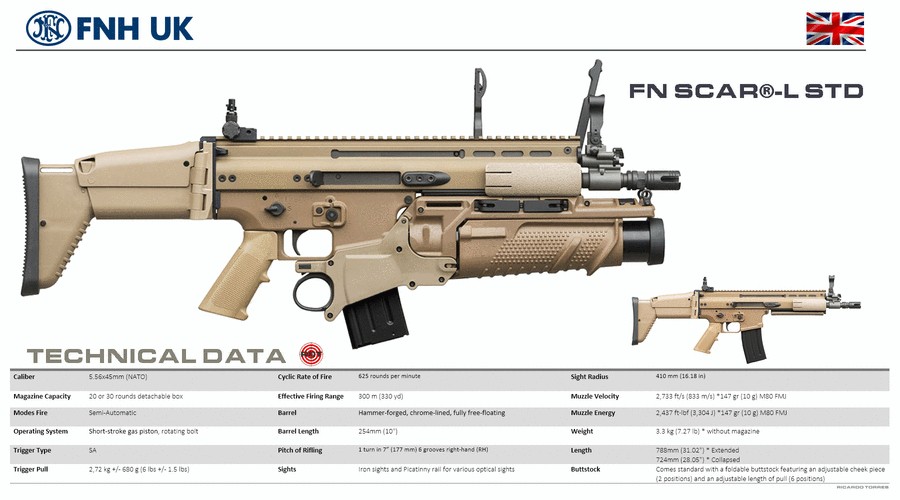 该枪的性能非常优秀,整枪长965毫米,枪管长400毫米,空枪重量3.26千克,有效射程600米,枪口初速714米每秒,使用5.56毫米口径子弹,弹容量30发。这支步枪从头到尾都布满了战术导轨,位于铝质的外壳之上,两侧有两个可拆卸的轨道,下面还可以安装MIL-STD-1913的兼容附件,SCAR突击步枪的握把和M16的握把还可以互换。