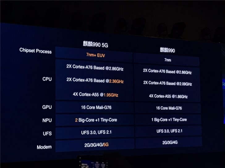 麒麟990E 相比麒麟990 5G在CPU上面是一样的,但是GPU核心砍掉了2个,NPU核心也砍了一个大核,不过它是集成了5G基带的。
