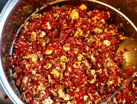 备用食材:红椒1500克,干红辣椒1000克,食盐635克,豆瓣680克,高度白酒1000克,花椒48克,醪糟100克,菜籽油1900毫升;