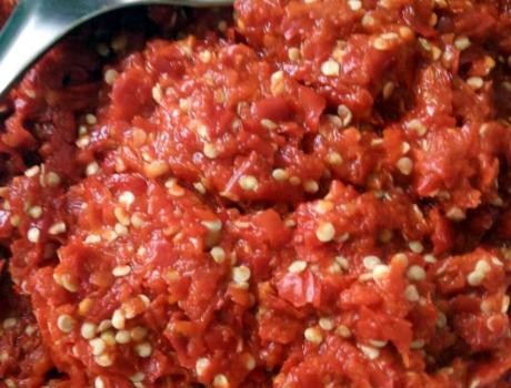 第三步,豆瓣泡好后,用手将其捏碎,放入在辣椒碎中,搅拌均匀,加上食盐、花椒和甜酒,充分搅拌均匀;