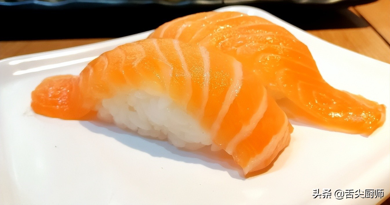 5、切好以后,喜欢吃芥末的可以在饭团上涂抹一点芥末,不喜欢吃的可以不放,然后在上面放上一个三文鱼片。摆盘以后,即可开吃。当然也可以在吃的时候蘸一点芥末,那味道简直美极了。