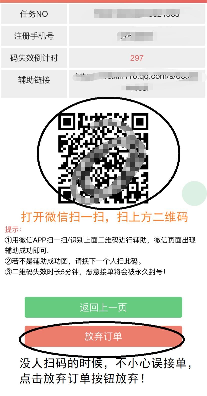 (1)接到订单,尽量在3分钟内完成;若意识到无人帮忙扫码,请点击放弃按钮放弃订单(接单后的60秒内可放弃)