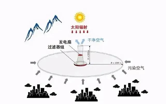 这座净化塔的使用原理也并不复杂,塔底有两座大风扇,负责把空气从风口吸入,净化塔内有数层空气净化网,会把吸进去的空气过滤多次,让空气质量达到优良标准,而净化塔的塔身可以吸收太阳光热,塔内温度逐渐升高,被净化过的空气就会向上排出,从而再吸入下一批空气,循环下去,就完成了净化功能。