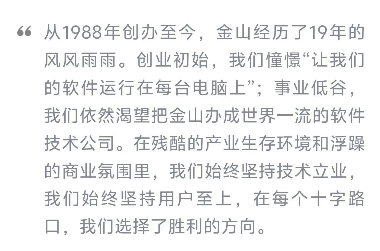 2007年9月18日,金山公司在香港港丽酒店举行上市路演。10月9号,金山成功在香港主板挂牌上市。雷军拒绝了秘书准备的官方文本,亲自撰写一封致全体员工的信。