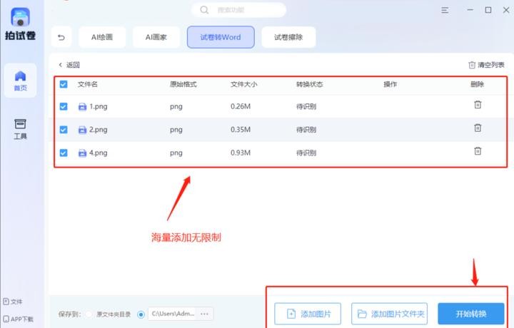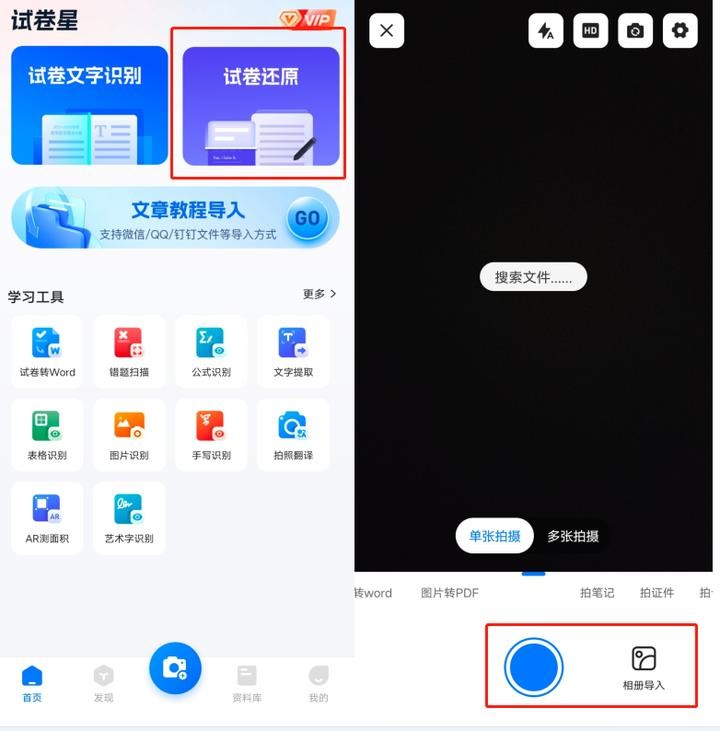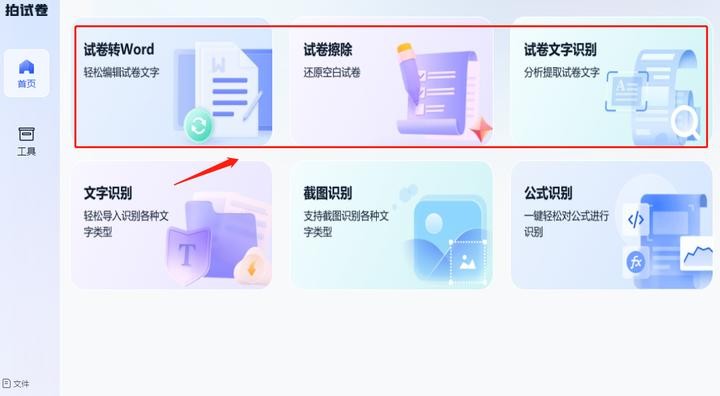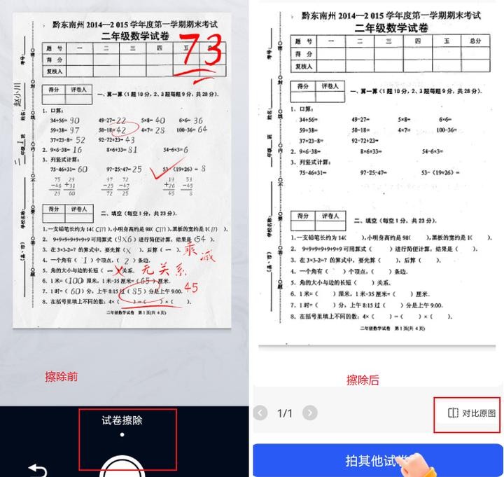 打开界面之后直接选择右上角的“试卷还原”,然后拍摄需要处理的试卷图片或者是从相册中上传扫描,就会自动识别,擦除多余字迹!还支持超多张试卷进行批量擦除~太方便啦