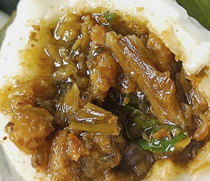 馅料有两种,咸的是芽菜和肉粒组合,咸香芽菜加上完美的猪肉组合在一起,直接就能让人尝到新鲜的滋味,就是这种能让人眉毛都要吃掉的完美组合。