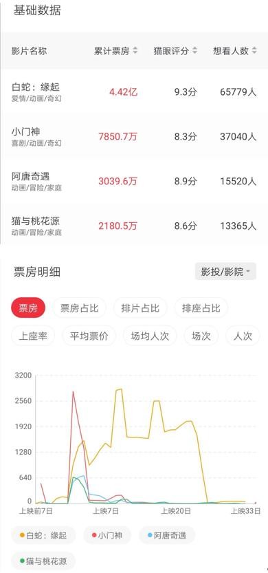 冲破4亿票房的《白蛇:缘起》是追光动画的第一部过亿电影,此前,无论是宣传力度较大的《小门神》(7776.7万),还是更早的《阿唐奇遇》(3039.3万)、《猫与桃花源》(2180.5万),票房均止步于千万级别,而这三者在猫眼平台上都是8分以上的动画。相较而言,猫眼9.4、淘票票9.3以及豆瓣8.1的评分,让《白蛇:缘起》在无论是票房和口碑上,都比同门“前辈”作品“更上一层楼”。