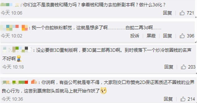 该声明一出,就引起了网友的热议,质疑追光动画此番动作是为了“炒冷饭圈钱”“没必要做3D重制版,等第二部再做3D”……