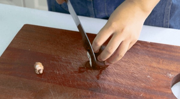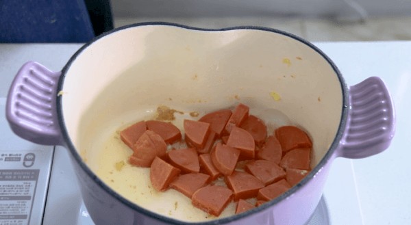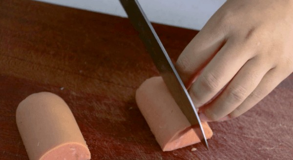 1.将香菇洗净,切成薄片;火腿肠先对半切开,再次对半切开,然后切成薄片