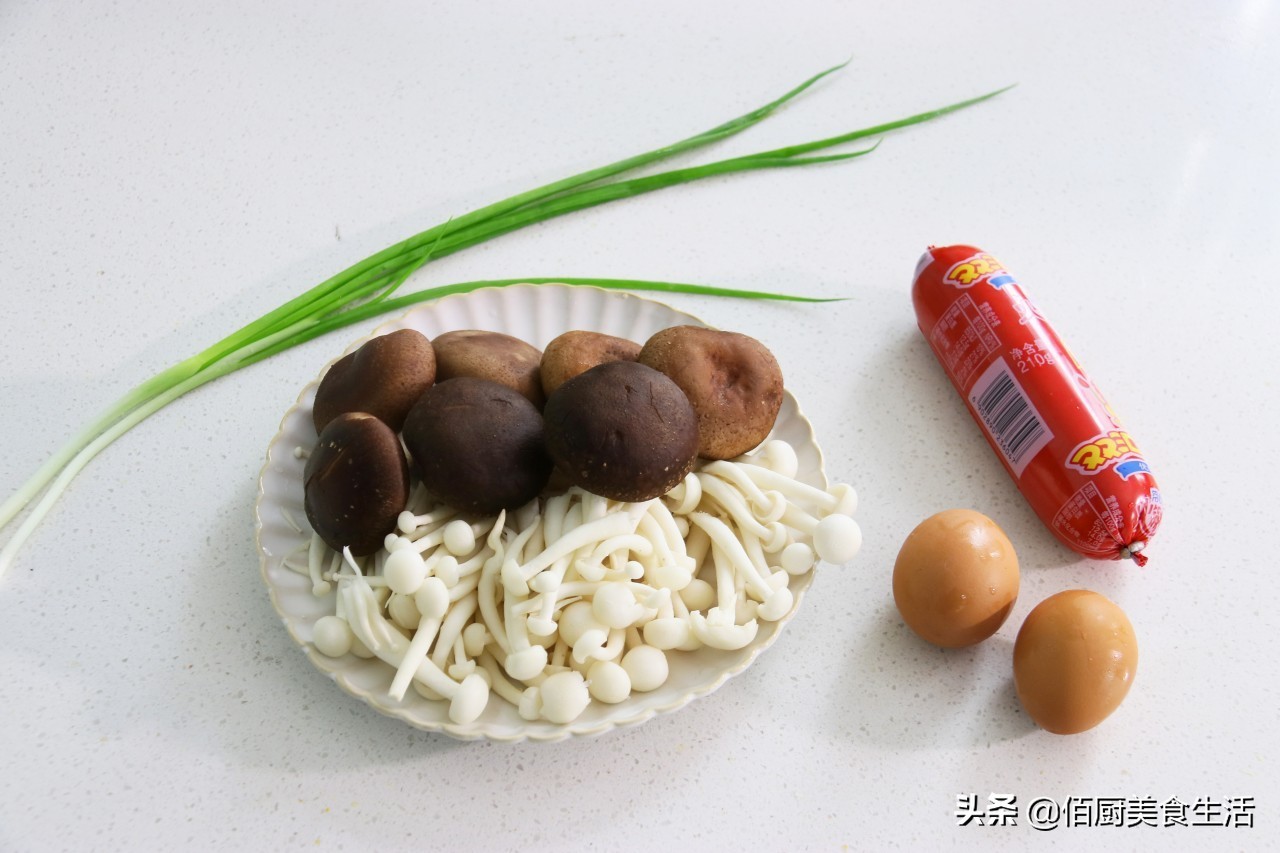 香菇200g/白玉菇200g/鸡蛋2颗/火腿肠1根/小葱2根/食盐1勺/生抽/料酒/白胡椒粉