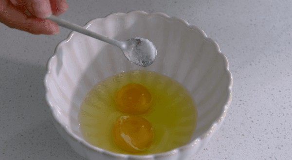 3.向碗中打入2颗鸡蛋,然后加入1勺食盐搅散