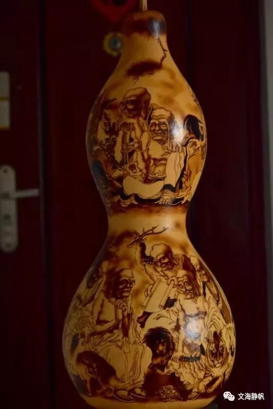 烙画葫芦艺术家通过电烙铁加温在葫芦上加工作画,也称火绘,通过调节温度的高低,把葫芦表皮碳化,从而达到颜色深浅,加工出每幅作品所需要的点线面,高光低光,远近层次。相传起源于汉代,后失传,清朝遂又兴起。以前叫‘葫芦烧画’,清代时叫‘烫画’,明代以前叫‘烧画’,老百姓则称它为‘烙画’, “葫芦制作作品种类达到万余种,从传统的葫芦文化、福、禄、寿、喜到工笔、写意、人物、山水、花草、鱼虫书法艺术,以及现代工艺设计融汇贯通,无不涉猎,不断创作出独特新奇的葫芦世界。