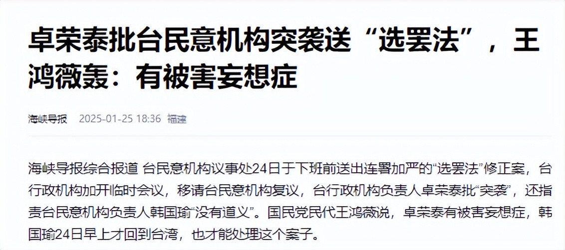 今年1月更绝,台民意机构送出"选罢法"修正案,卓荣泰立马喊"突袭",还指责民意机构负责人韩国瑜"没道义"。国民党民代王鸿薇当场怼回去:卓荣泰这是"被害妄想症"啊!