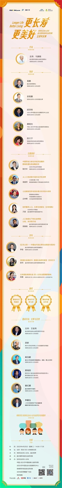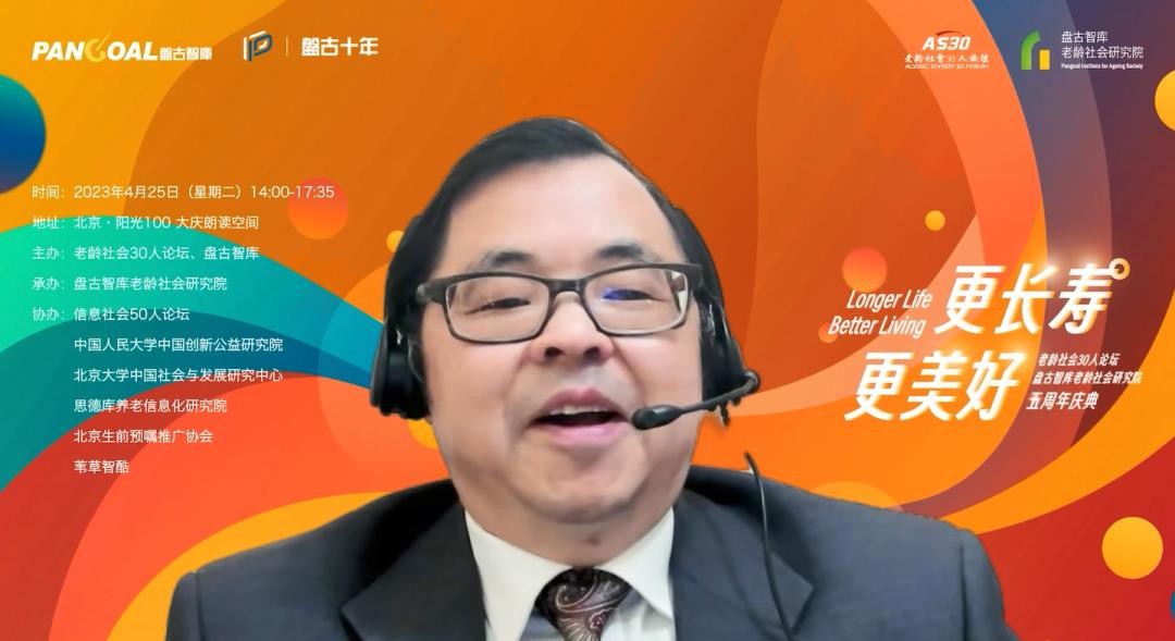 4月25日,“更长寿·更美好(Longer Life·Better Living)——老龄社会 30 人论坛及盘古智库老龄社会研究院五周年庆典”在京成功举办。庆典活动由老龄社会 30 人论坛、盘古智库主办,盘古智库老龄社会研究院承办,信息社会 50 人论坛、中国人民大学中国创新公益研究院、北京大学中国社会与发展研究中心、思德库养老信息化研究院、北京生前预嘱推广协会、苇草智酷协办。近百位社会各界深耕老龄相关领域的研究者和实践家、媒体人等到场参会,凤凰网风直播、头条养老、学说平台、百度百家号、新浪新闻、网易新闻等平台线上同步直播,在线参与人数近100万。