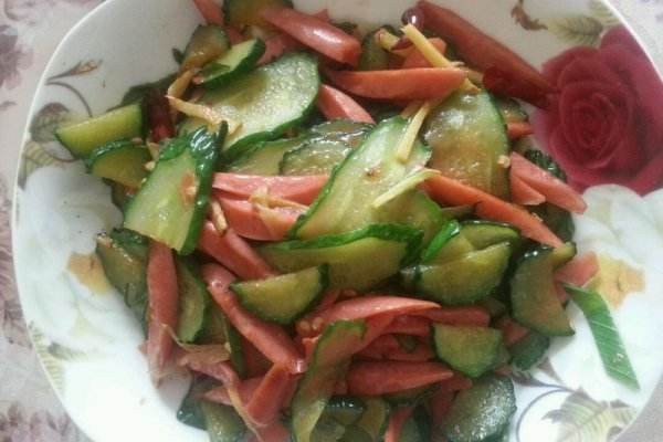 材料:黄瓜、香肠、食盐、醋、香油、白糖、胡椒粉、芥末油、鲜贝露
