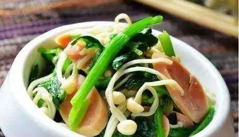 材料:菠菜、金针菇、火腿肠、橄榄油、盐、葱姜、糖、鸡精、水淀粉