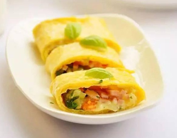 3、鸡蛋凝固后,撒上香葱、番茄、火腿丁,小心卷起。