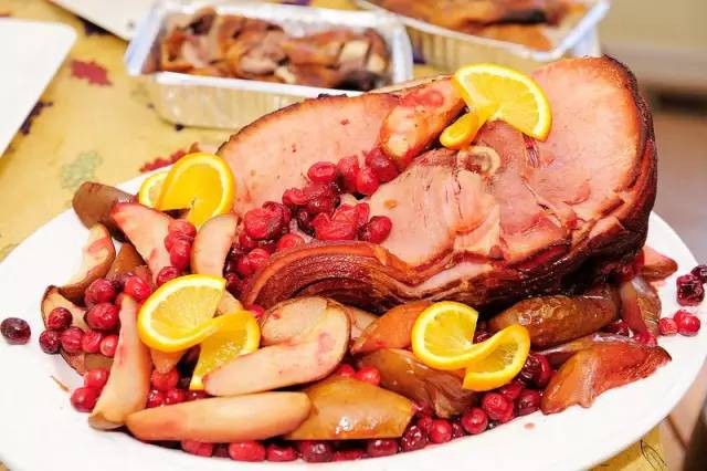 3、将处理好的火腿放入烤箱,用150℃烤10∼15分钟,再换180℃烤20分钟即可搭配凤梨沾酱一起食用。