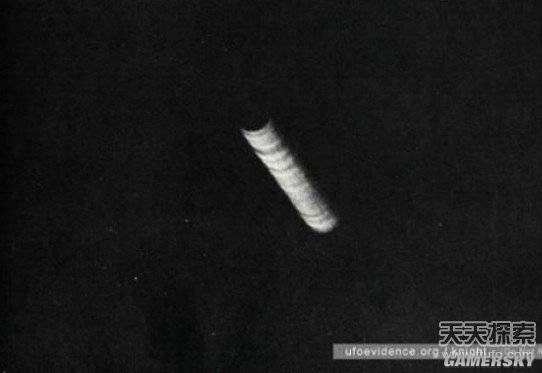 1950年3月20日,有人在美国纽约市上空拍摄到这个圆柱形UFO。