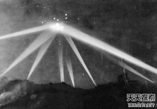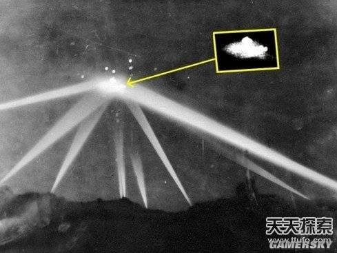 1942年2月25日,探照灯的灯光都集中在美国洛杉矶上空的一个不明飞行物上。那个明亮物体周围的亮斑,是地面部队的防空炮弹爆炸产生的碎片。