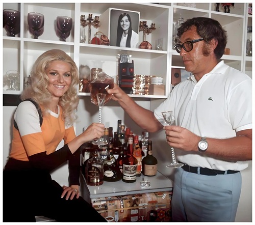 1971年8月,美国流行歌手佩吉·马奇与丈夫阿尼·哈里斯在慕尼黑家中的温馨场景。当时,家居装饰风格带有那个年代的特色,丰富的酒具和藏品展示出生活情趣,二人举杯互动!