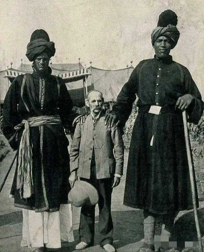 1903 年,在印度德里达巴尔,当地的警卫和一位美国摄影师一块儿合了影。你瞧瞧照片里那俩印度人,我看他们身高怎么着也得两米五往上走!这身高,放在哪儿不得让人惊叹啊!