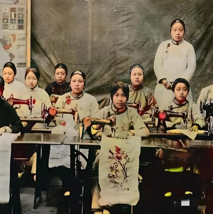 清朝末年,使用缝纫机的女工在工作!
