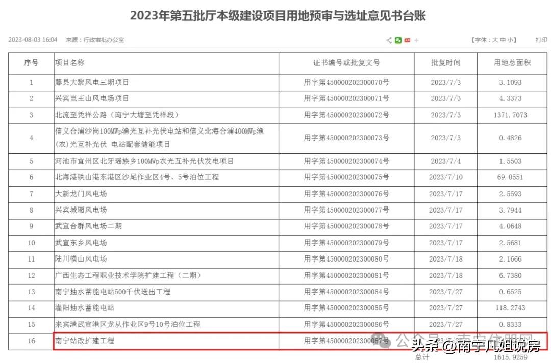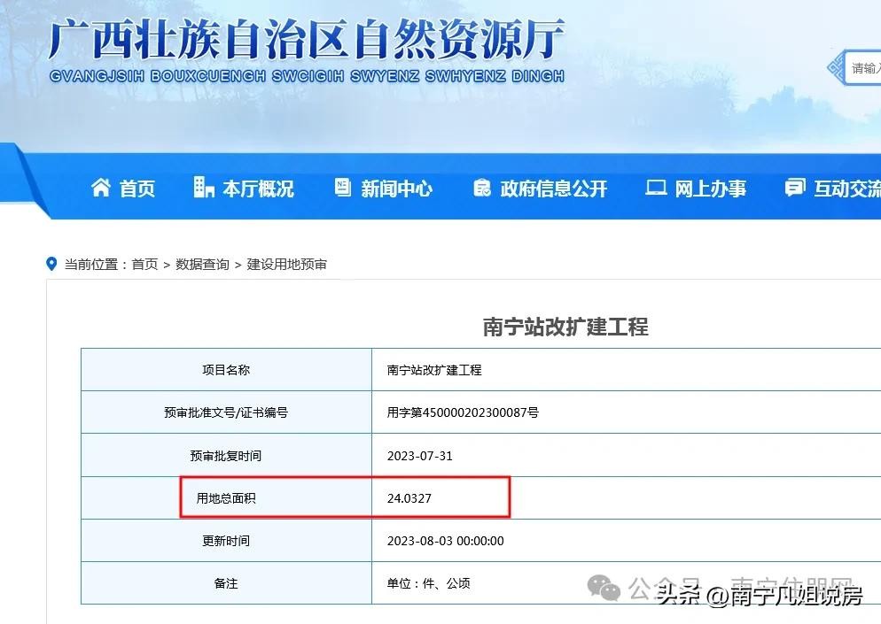 2023年8月,广西自然资源厅官网公布 “南宁站改扩建工程” 取得用地预审与选址意见书,项目用地预审于 7 月 31 日批复,明确用地总面积24.0327公顷(约360.49亩),这是关键的合规性一步,为后续土地征收、规划设计细化筑牢根基,让工程在法定轨道上稳步疾驰。
