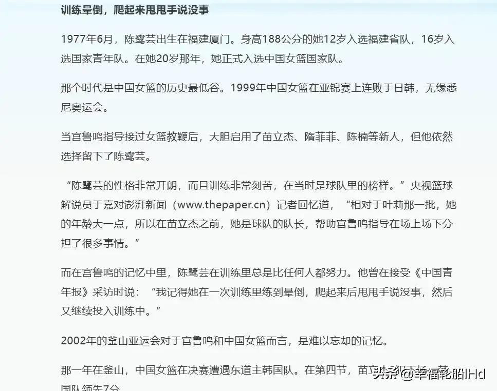 在球队中,陈鹭芸是名副其实的精神领袖,她的故事被广泛传颂,成为后辈女篮球员的榜样。宫鲁鸣曾在接受采访时强调,陈鹭芸在训练中的刻苦表现深深影响着队员们,即便她已经无法参加训练,但依然会在场边为大家加油助威。