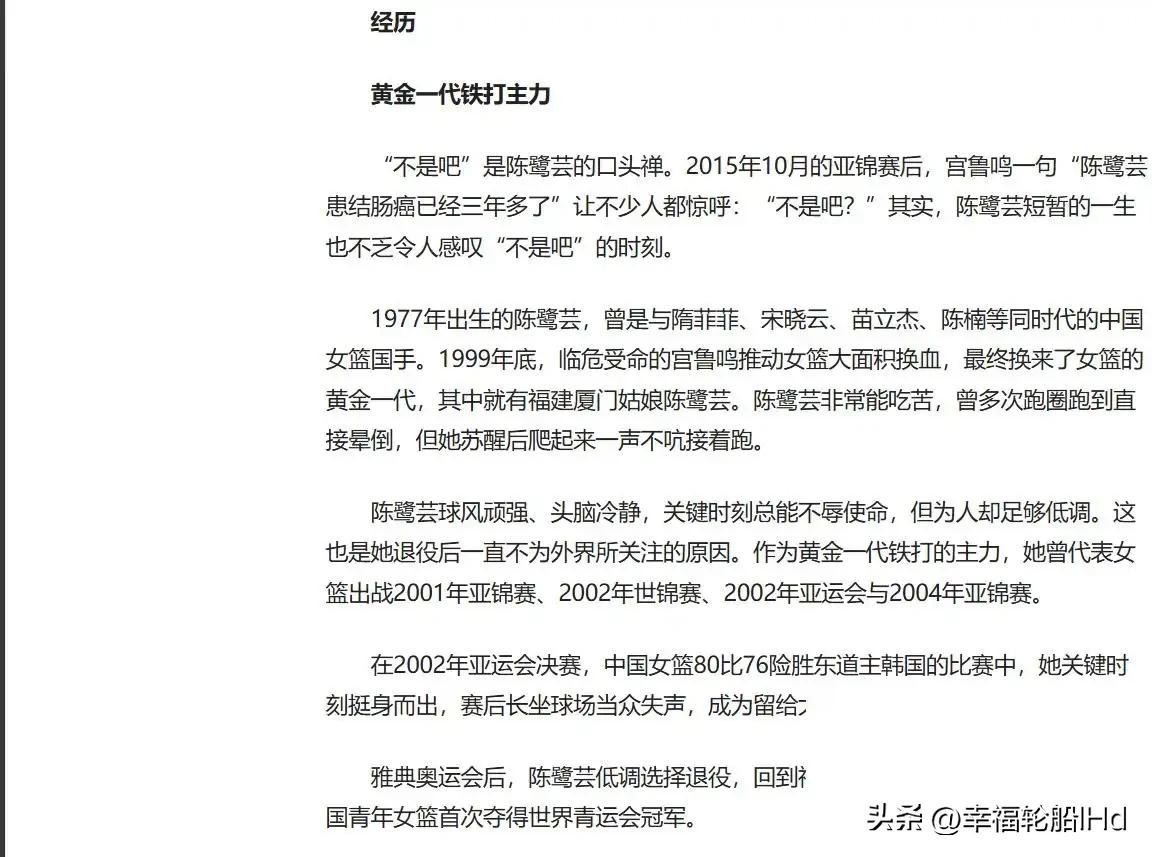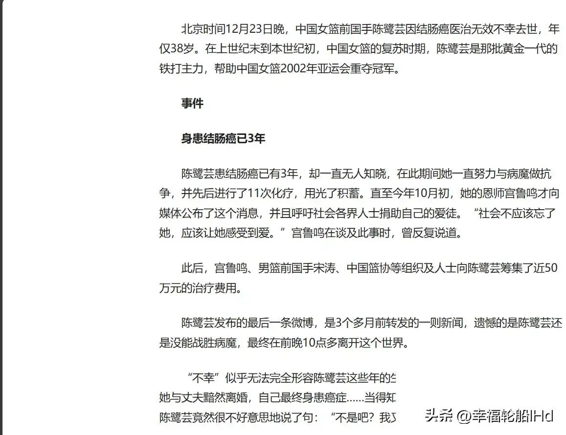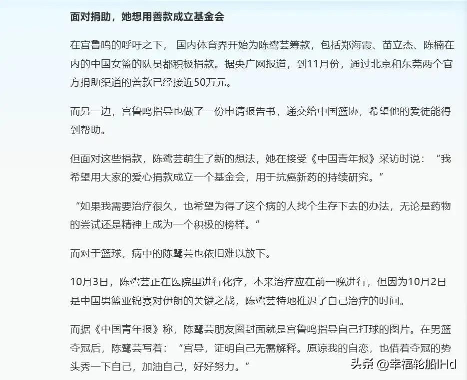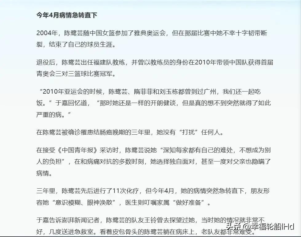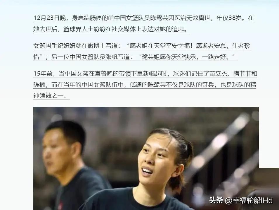 15年女篮国手陈鹭芸离世:与病魔缠斗3年,11次化疗后裸捐50余万