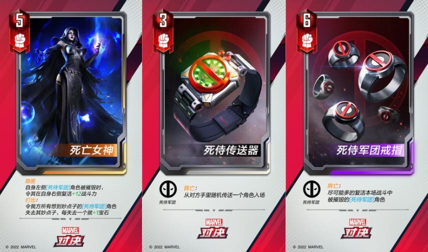 而死侍,则是作为新套牌新英雄加入到了其中,当然了,在漫威对决中的死侍和原著中的死侍还是稍有不同的,虽然继承了原著中的死侍“骚浪贱”的风格,但他的新能力更吸引玩家关注,在漫威对决中,死侍有一个全新的机制“妙点子”,不仅能通过这个“妙点子”实现电影原著中的无限复活,如果“妙点子”升级还能提升死侍军团10倍的战力!非常强大。
