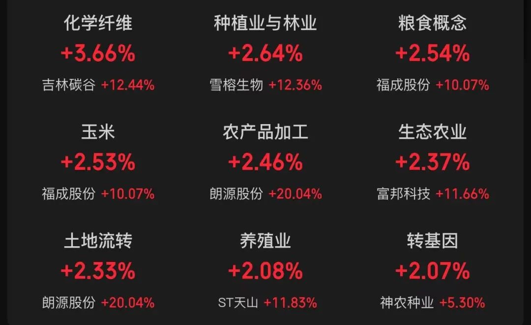 盘面上,化学纤维、种植业与林业、粮食概念、玉米、农产品加工、生态农业、土地流转、养殖业、转基因等板块涨幅靠前;