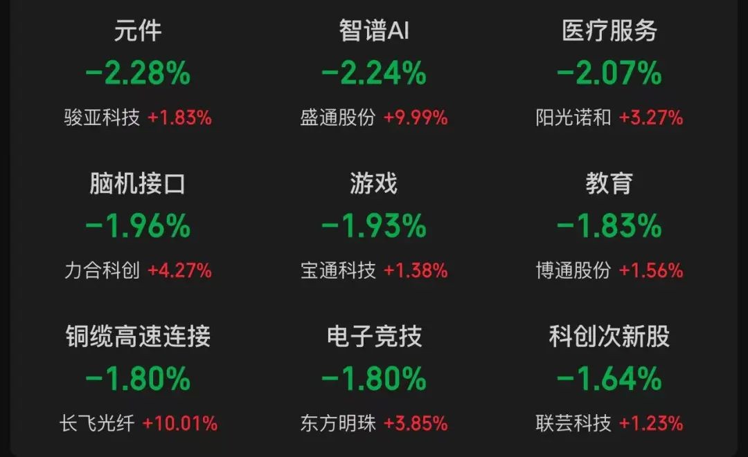 元件、智谱A医疗服务、脑机接口、游戏、教育、铜缆高速链接、电子竞技、科创次新股等板块跌幅靠前。