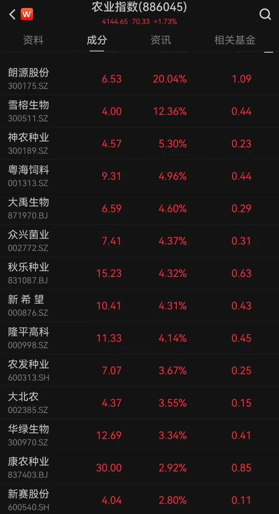 整体来看,农业股逆势大涨,智慧农业涨停、朗源股份20CM涨停,秋乐种业、神农种业、大禹生物等跟涨。