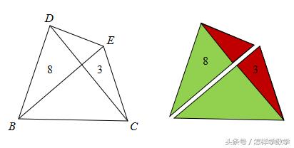 四边形BCED可以分成两个三角形,两个三角形共用一条边,所以内部的两个三角形之间(红色比绿色)的比例是相等的,再加上每个小三角形面积都是整数,所以上下相对的这对三角形的面积就是1和24、2和12、3和8、4和6中的一组。再把顶上的三角形ADE考虑进来,就可以解题了。