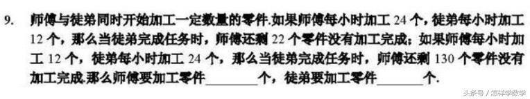 看起来是个工程问题,其实只是一个数量关系的问题。如果我来教,我会引导学生换个角度去看问题,把题目的意思转化成:“师傅的数量减去徒弟数量的2倍,还剩22个;师傅的数量减去徒弟数量的1/2,还剩130”,解题就很轻松。