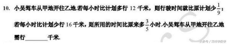 点评:这道题是比课本稍微复杂一点的多步计算。时间少花1/9,那么速度要增加1/8,所以计划的速度是96千米/小时。如果速度减少1/6,那么时间要多花1/5,所以计划的时间是3小时。