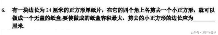 点评:这道题是培训班会讲的基础题目之一。如果你做过,那么没难度,只要记住小正方形的边长是大正方形的1/6就好了。否则,基本做不出来。求三次函数的最值是比较困难的,如果不用高等数学,需要一种很有技巧性的方法。
