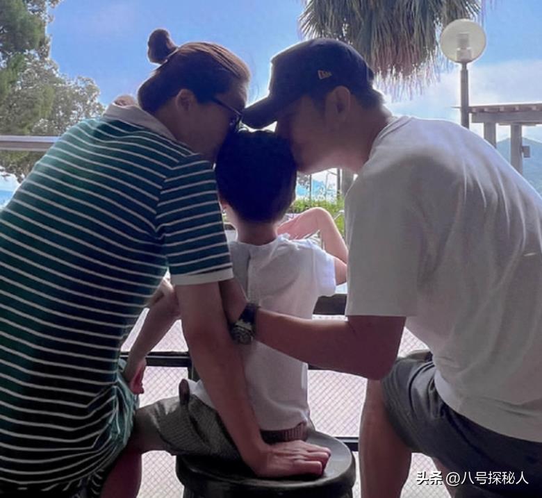 照片中她与傅程鹏一左一右亲吻孩子的头发,画面看起来十分温馨有爱。